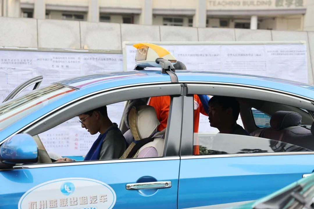杭州市中策职业学校,送考志愿者让早到的考生坐在车里休息、吃早餐,为他们缓解紧张情绪。