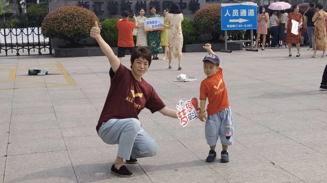 杭州第四中学(下沙校区)考点前,家长带着考生弟弟来为姐姐加油。