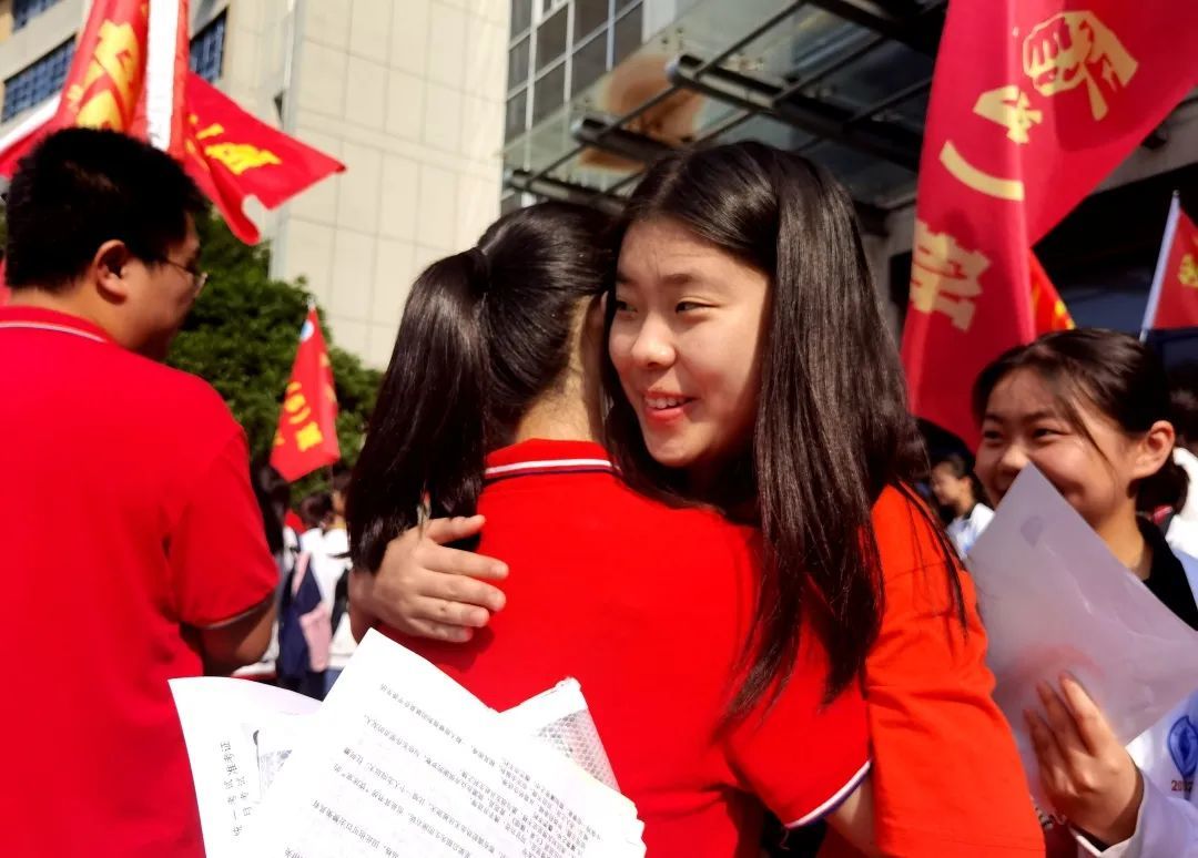 衢州三中、信安中学高三班主任及语文老师们在首场考试前集体送考,大家身穿红色体恤,寄寓喜庆成功之意。进考场前,考生们纷纷和老师们拥抱、握手、击掌,给自己、给彼此加油鼓劲。