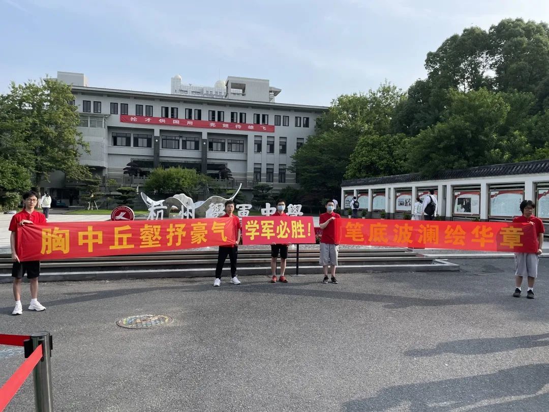 杭州市中策职业学校门口,两名同学定制横幅,为考场内的好友鼓劲。