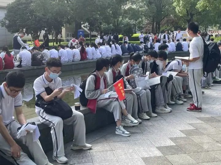 温州市第二外国语学校考点,考生们围坐在考场门口的阴凉处进行最后一次温习。