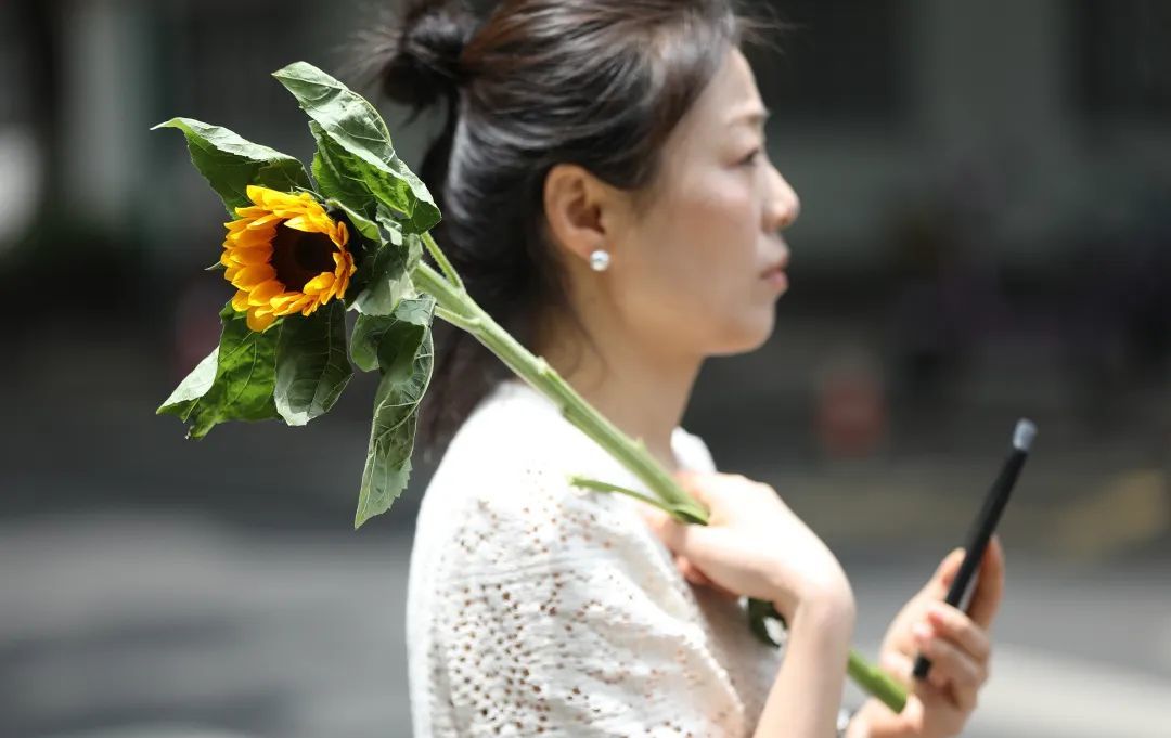 宁波镇海中学考点,家长拿着一束向日葵等待孩子,寓意“一举夺魁”。