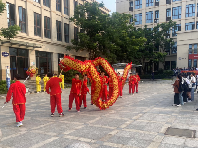 舟山职业技术学校,高一高二同学舞龙开路,祝福学长学姐 “金榜题名、一飞冲天”。