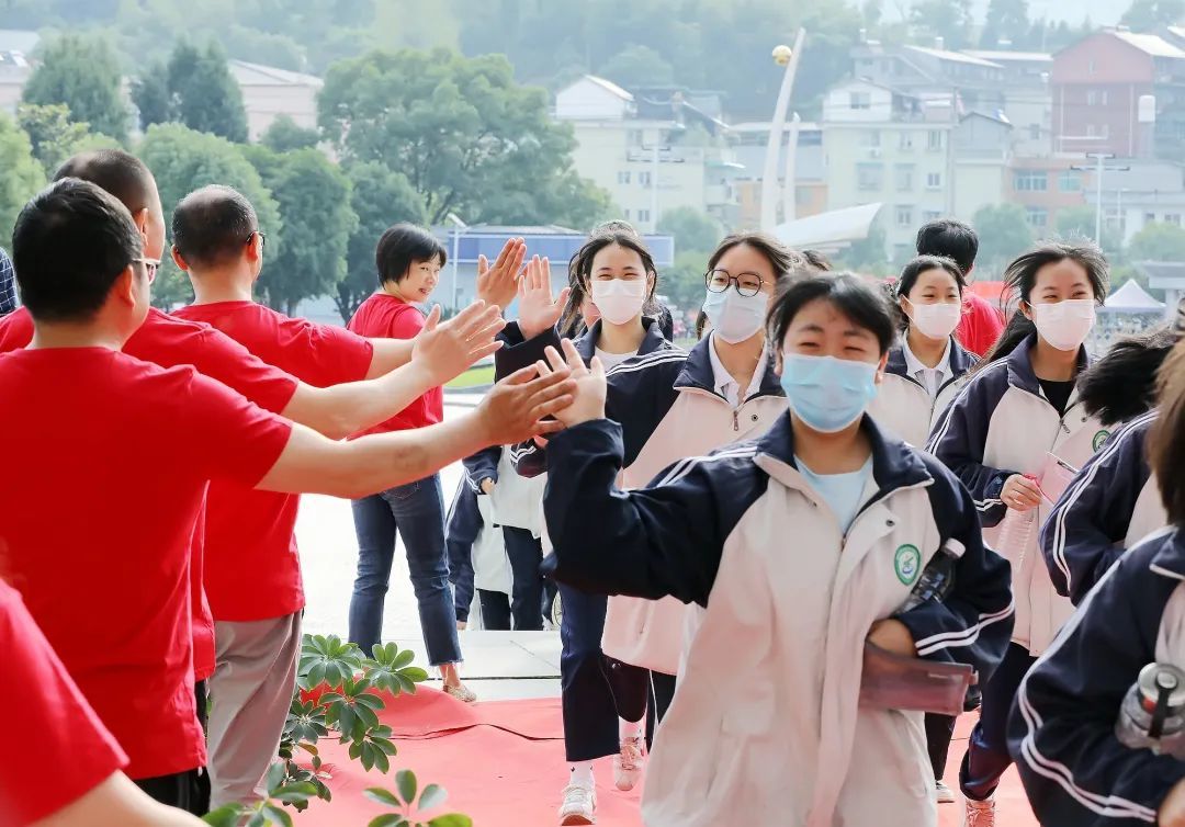 丽水市遂昌职业中等专业学校,身穿红色“高考加油”文化衫的教师与考生逐一击掌,护送他们走过“金榜门”前往考场。
