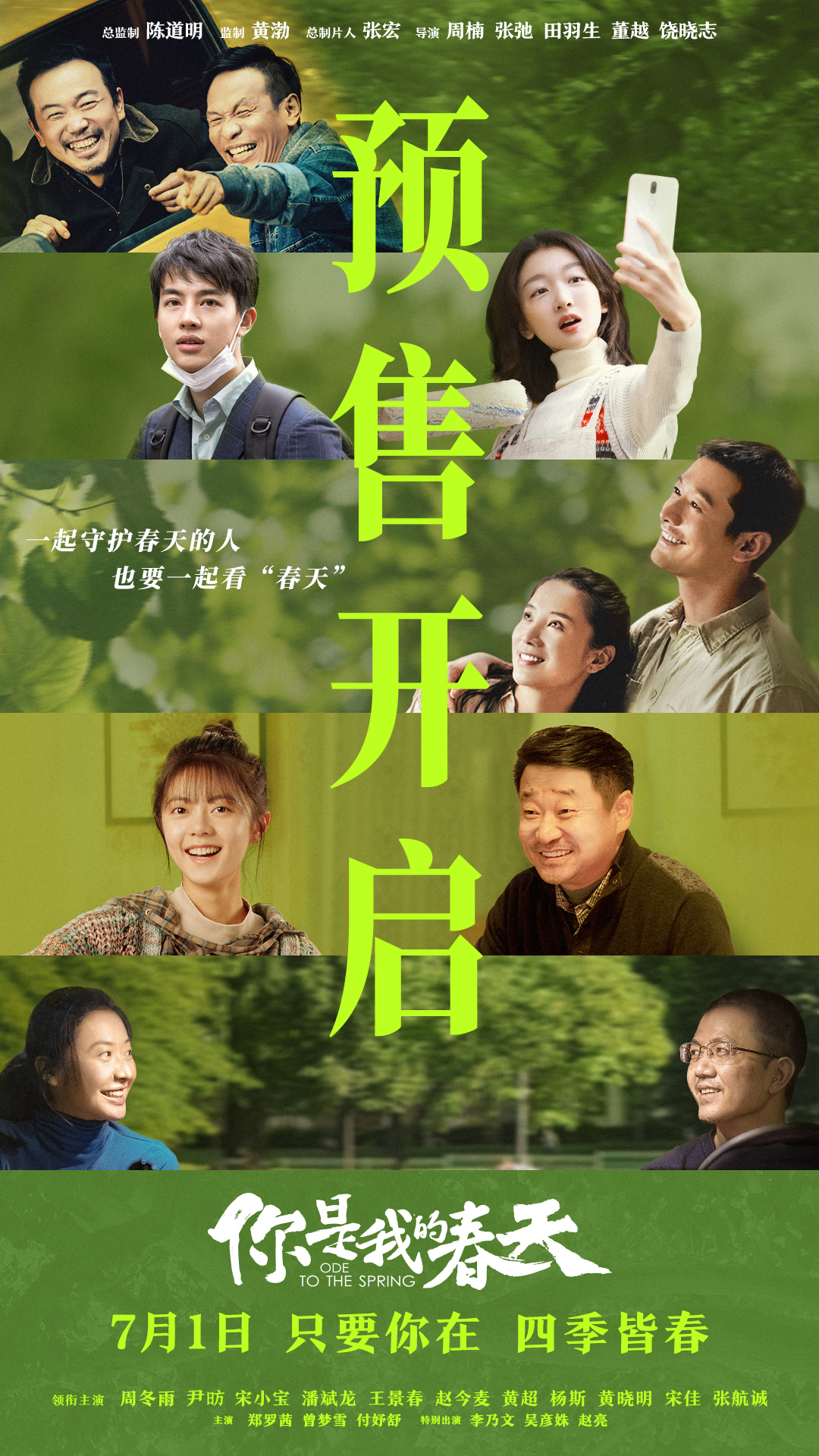 由中国电影家协会指导拍摄,陈道明任总监制,黄渤任监制,张宏任总制片人,周楠、张弛、田羽生、董越、饶晓志执导,周冬雨、尹昉、宋小宝、潘斌龙、王景春、赵今麦、黄超、杨斯、黄晓明、宋佳、张航诚领衔主演的电影《你是我的春天》将于7月1日全国上映。今日,电影正式开启预售,向全国各地的观众发起“看春天”的邀约。