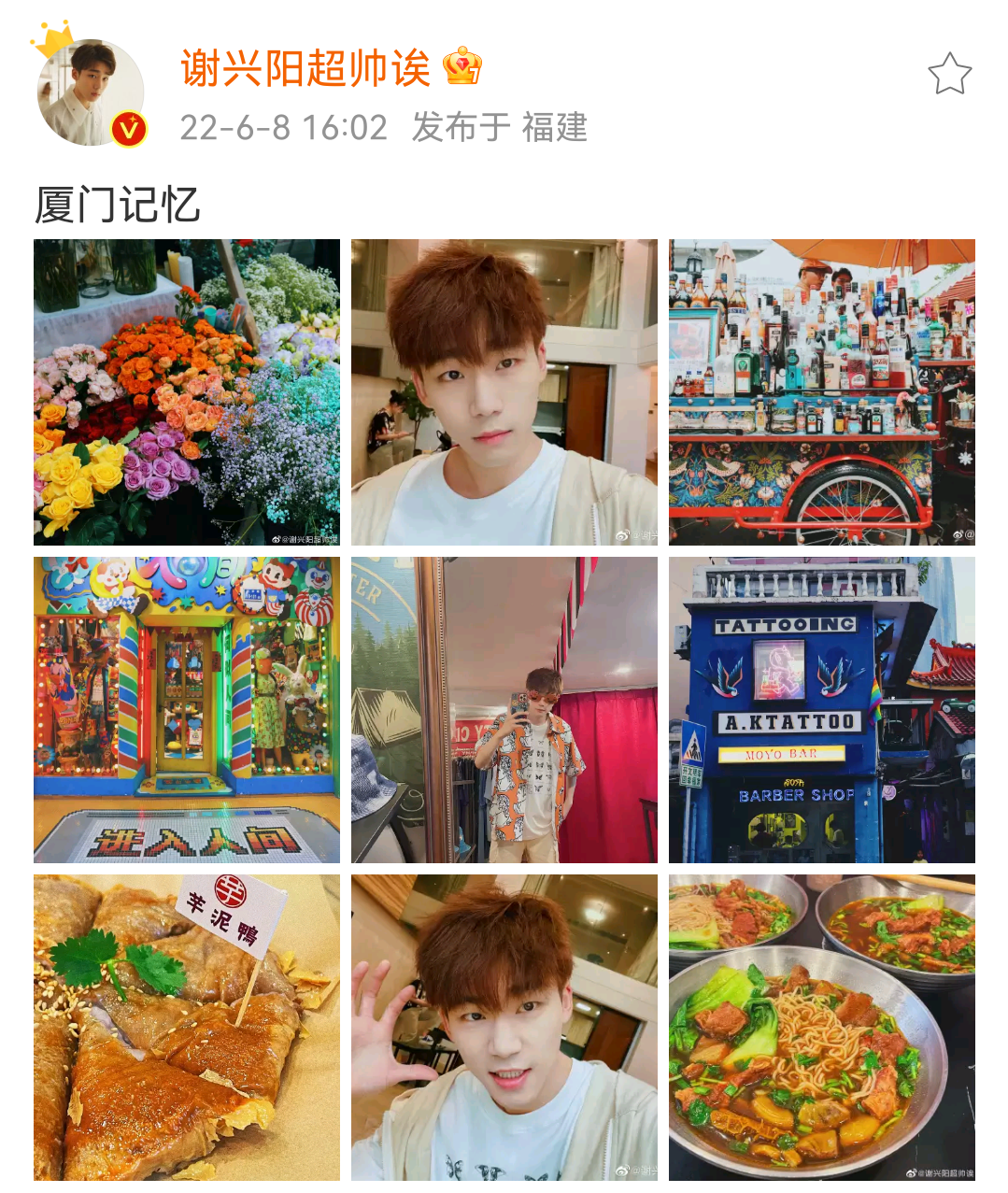 除此之外,谢兴阳还分享了牛肉面、芋泥鸭等厦门美食以及鲜花、路边的酒饮料摊等风景照。引得网友纷纷评论:“说实话最后一张图馋到我了”。