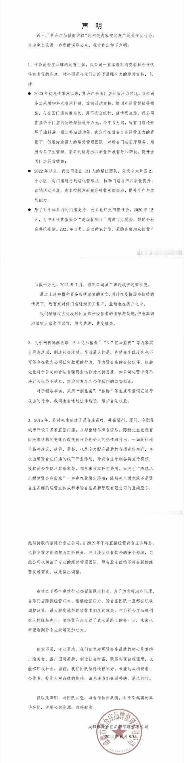 6月8日晚间,陈赫创立的贤合庄火锅运营主体成都市贤合庄品牌管理有限公司(下称“成都贤合庄”)发布声明称,网传陈赫收取“2.4亿加盟费”、“3.7亿加盟费”等内容,均为恶意造谣,制造社会矛盾。陈赫既没有也不可能存在收支公司任何款项的行为。