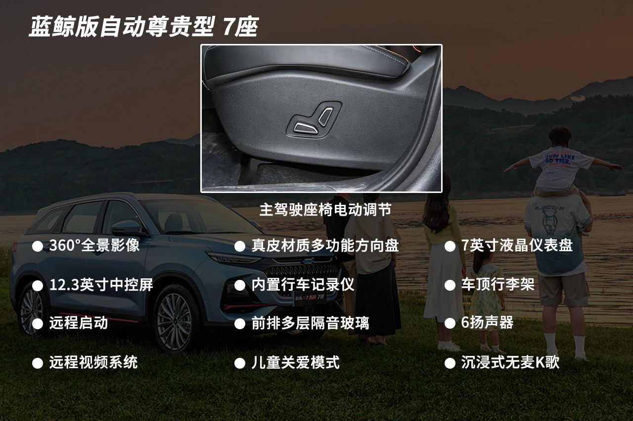 蓝鲸版自动尊贵型 7座相比上一款贵了1万元整,配置方面也增加了不少,首先主驾驶座椅由手动调节升级为了电动调节,更加的简便、省力;液晶仪表盘和中控屏的尺寸也都有所提升,并且中控屏增加了GPS导航、车联网、OTA、语音识别等功能,不仅增添了科技感,也提升不少日常用车的便利性。而像是360°全景影像、远程启动、车道偏离预警也都是非常实用的配置。总的来说,蓝鲸版自动尊贵型 7座贵这1万元还是非常值的,也是我最为推荐的车型,推荐指数:★★★★★
