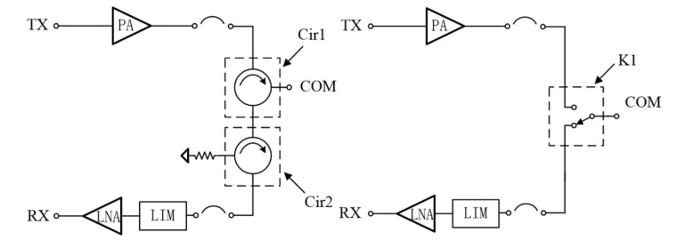 如上图(左侧),为现有射频收发组件的环形器收发切换实施例的原理图,其中通过第一环形器Cir1和第二环形器Cir2为发射射频信号和接收射频信号提供不同的传输路径。如上图(右侧),为现有射频收发组件的单刀双掷射频收发开关收发切换实施例的原理图。在该方案中,将环形器替换为单刀双掷射频收发开关K1。其中的TX均为雷达系统的射频输入端,RX为雷达系统的射频信号接收端,COM为射频信号收发公共端。