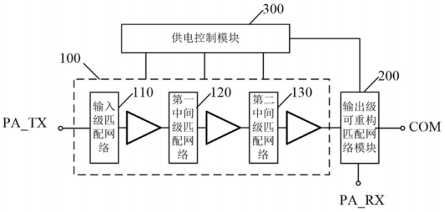 如上图,为该专利中发明的匹配网络可重构的多功能功率放大器的原理框图,该功率放大器包括发射功率放大器模块100、输出级可重构匹配网络模块200以及供电控制模块300。其中,发射功率放大器模块的输入端与多功能功率放大器的射频输入端PA_TX连接,用于对待发射的射频信号进行放大后输出。