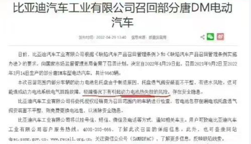 2022年4月,比亚迪迫于频繁自燃的压力,终于发布了召回公告。并且,在召回公告中明确表示,在本次召回的部分车型中,在极端情况下有引起动力电池热失控的风险,存在安全隐患。在比亚迪发布召回公告后的5月中,比亚迪旗下车型连续发生了17次的自燃事故。与此同时,在同年的6月中,已经发生了4次自燃。
