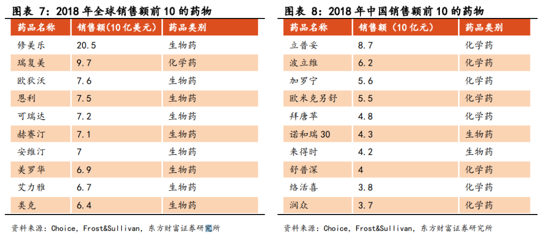 另外,2018年,在全球销售额前10的药物中,生物制药就有9家,贡献了近9成的销售额。