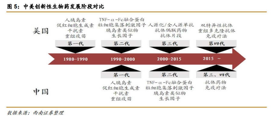 1990年之后,人胰岛素、促红细胞生成素、干扰素以及重组疫苗也纷纷登上舞台。不过在这一阶段,欧美国家已经涉足以TNF-α-Fc融合蛋白、粒细胞集落刺激因子、胰岛素类似物、生长因子为主的第二代生物药研制。在这期间,我国生物药落后了整整一代。