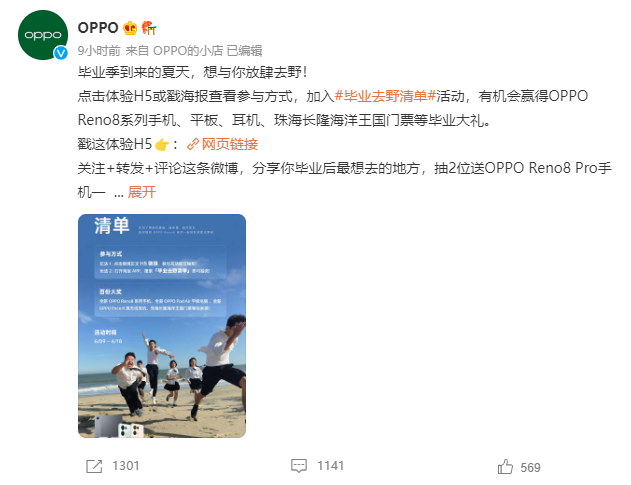 所以说,OPPO Reno8 Pro+在各个方面都有着不俗的表现,这对于毕业的学子们来说无疑是一个稳赚不赔的买卖,而现在OPPO Reno8 Pro+到手价只要3689元起,而且还有最高24期的免息分期等优惠。同时OPPO官博还发起了毕业去野清单活动,重多OPPO产品福利可千万不要错过了。
