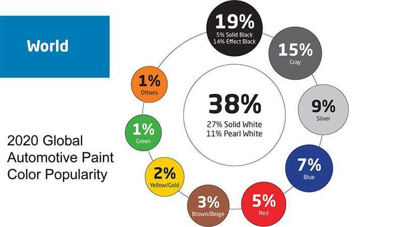 以下排除叫不出名字的特殊色,也不考虑消光、金属粉、变色、渐层、贴膜等特殊处理方式,根据Axalta汽车烤漆原料供应商的调查,昔日最不吃香的车色为绿色与黄色,但是近年来橘色成为衰退幅度最大的车色。目前最稀有的车色为紫色,比金色更少。至于白色车款数年来皆蝉联冠军,并且远远超过第二名的黑色。