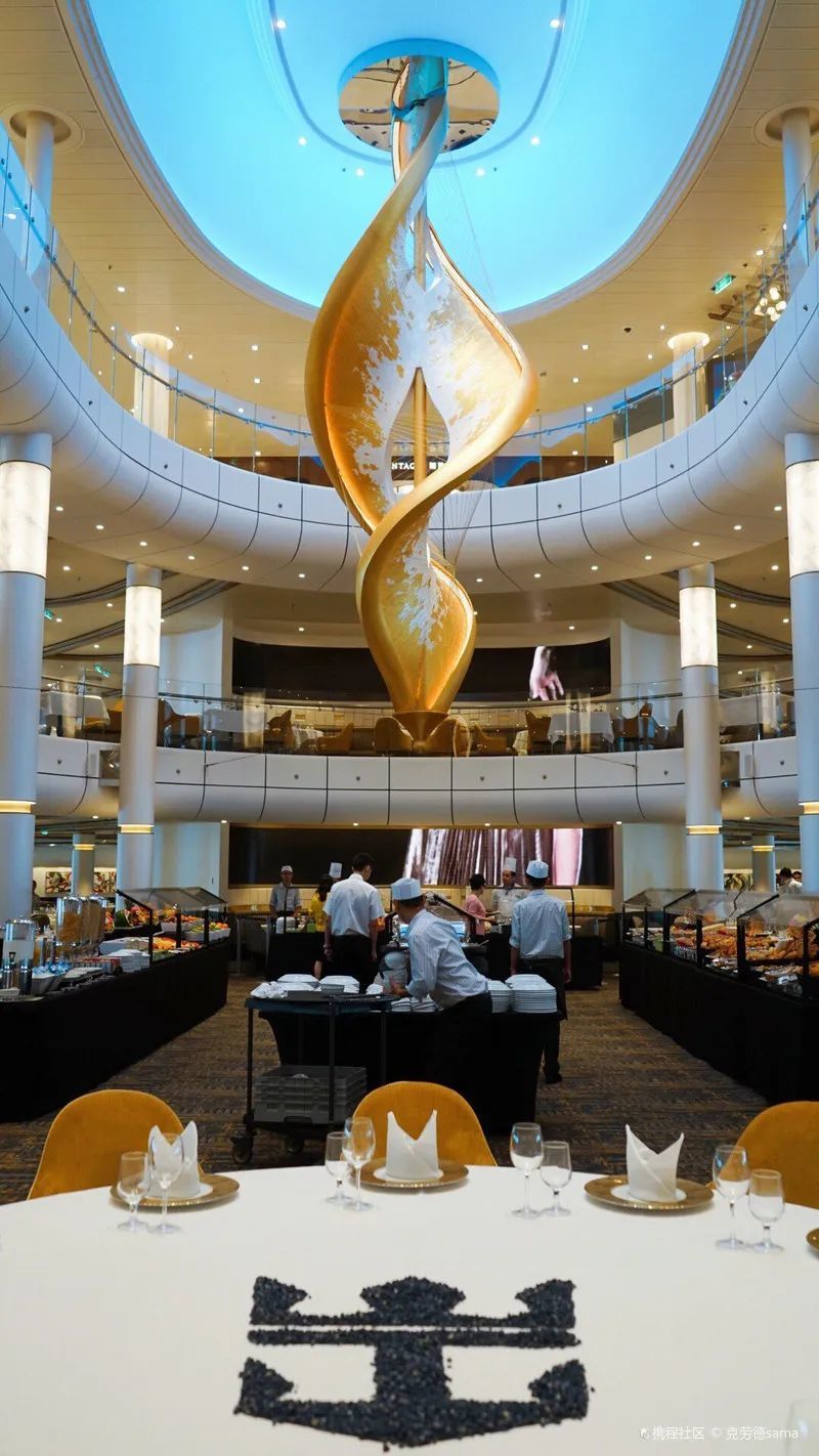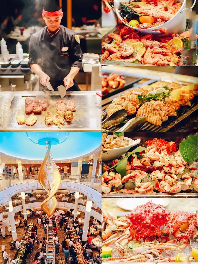 超霸气的主餐厅直接承包了2层游轮,最多可容纳一千八百多人,早中晚三餐都可选择在这里享用,不同种类的套餐、不同地域的特色美食几乎都能品尝到。