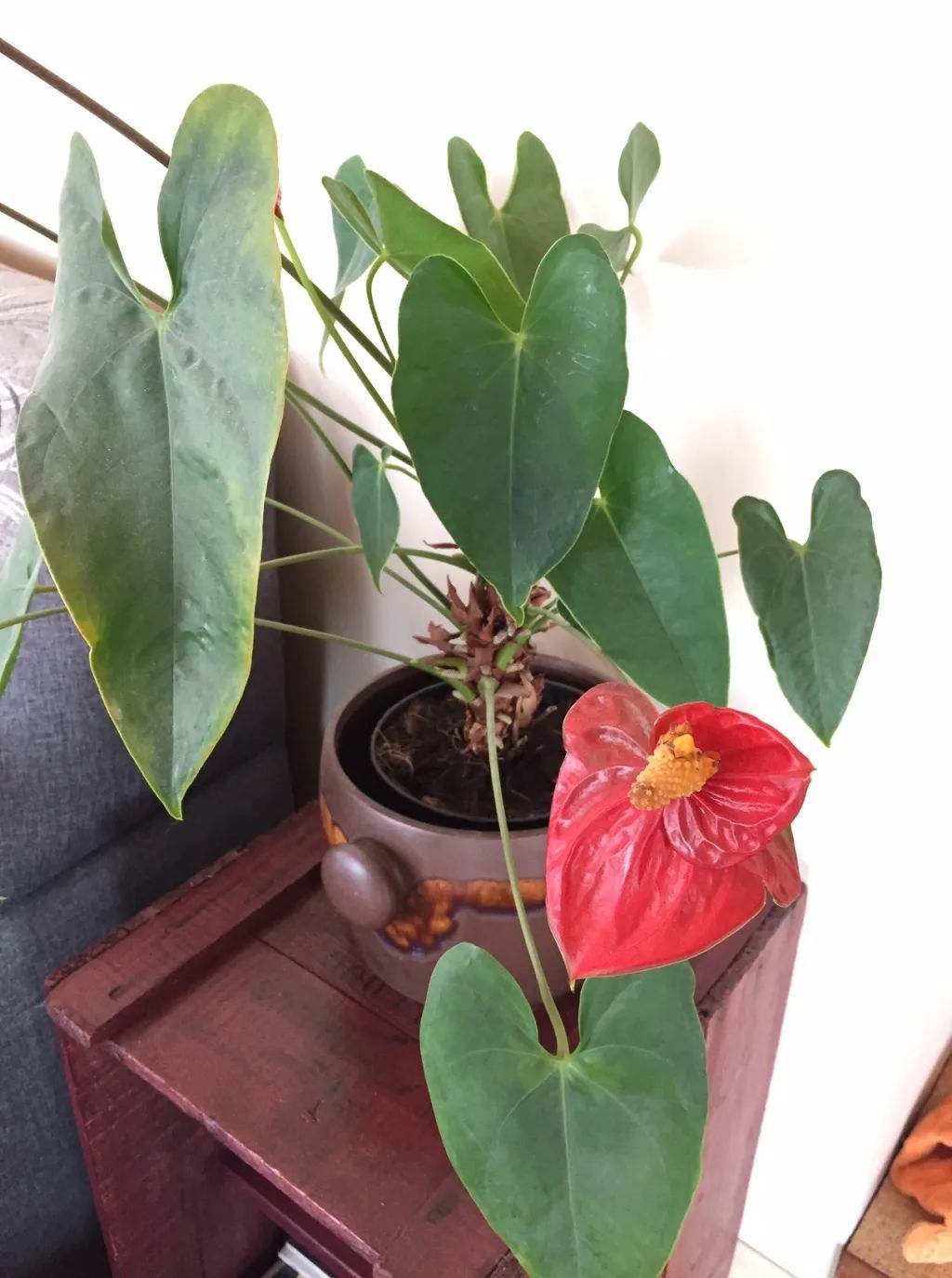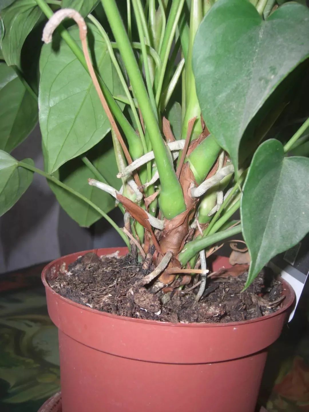 盆栽红掌只要长好了,它的植株底部的叶子会不断发黄干枯,时间久了,植株底部就会变得光秃秃的,它的主干上会长很多气根,植株不断长高。