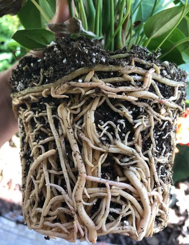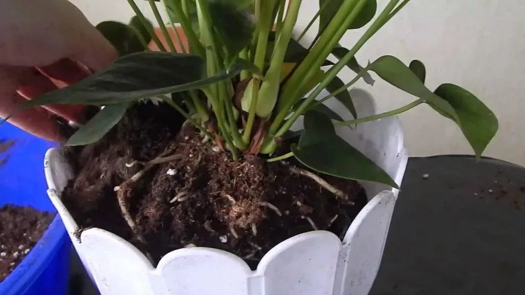 红掌的根系通常都是特别粗壮的,它们的根系会缠绕在花盆四周,有些甚至长满盆底。