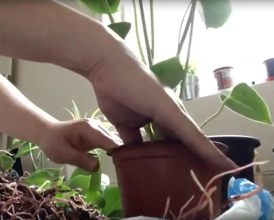 等盆土微干的时候,就可以脱盆处理,这样可以减少根部损伤。脱盆的时候可以将花盆倒置过来,用手指夹住植株底部,可以用手掌轻轻的捏一下花盆,或敲击花盆底部,如果根系长得特别紧,可以用筷子或竹签戳排水孔处,就可以将盆土脱盆。