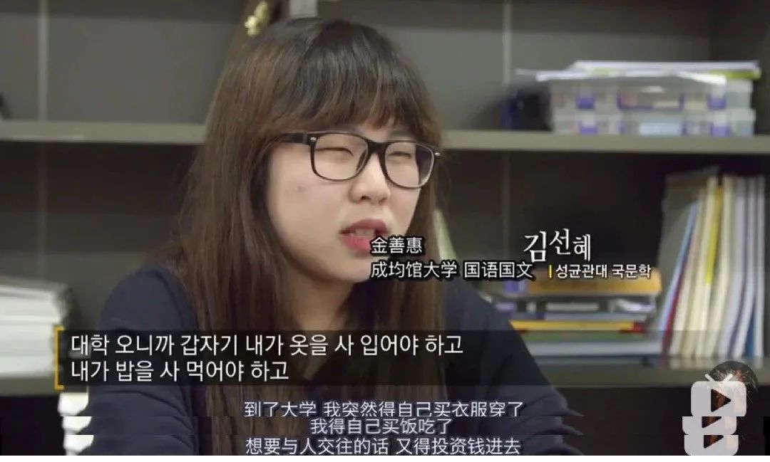 片中,入读成均馆大学(韩国名校之一)的金善惠,入学后却选择了休学,家境贫寒的她,只能靠兼职打工来赚取学费和生活费,为了尽快攒到钱复学,她每天只在钱包里放1万韩元(人民币60元),每顿饭只敢花3000韩元(人民币18元)。