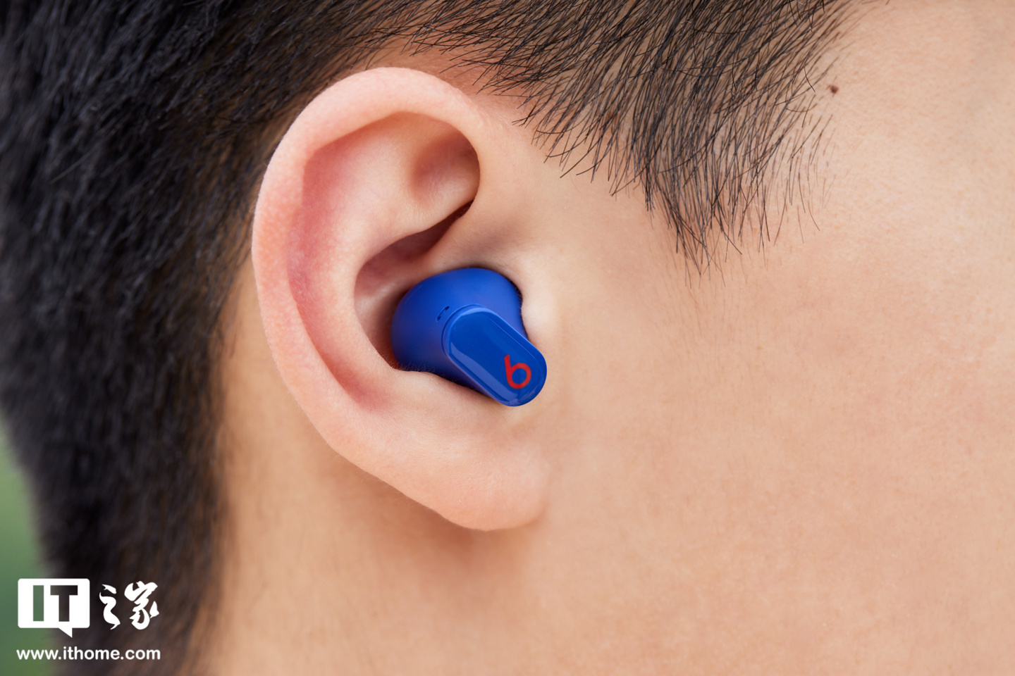 Beats Studio Buds 深海蓝耳机本体采用了同样的配色,整体蓝色打底,耳机外侧部分印有亮眼的红色标志,相比普通的黑、白色耳机,看起来辨识度很高。