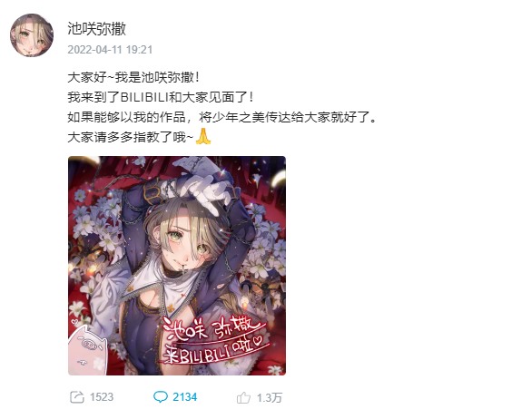 池咲弥撒这位主要画女性向男同本的知名画师,也在四月份来到了B站,吸引了大量散落在B站各大区域的男酮