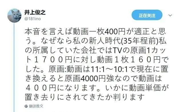 日本原画师井上俊之就曾经发言感慨:自己在35年前刚进入业界的时候,1张中间画的价格是160日元,到现在应该涨到400日元才算合理。结果现实并非如此,整整35年单价才涨了25%。