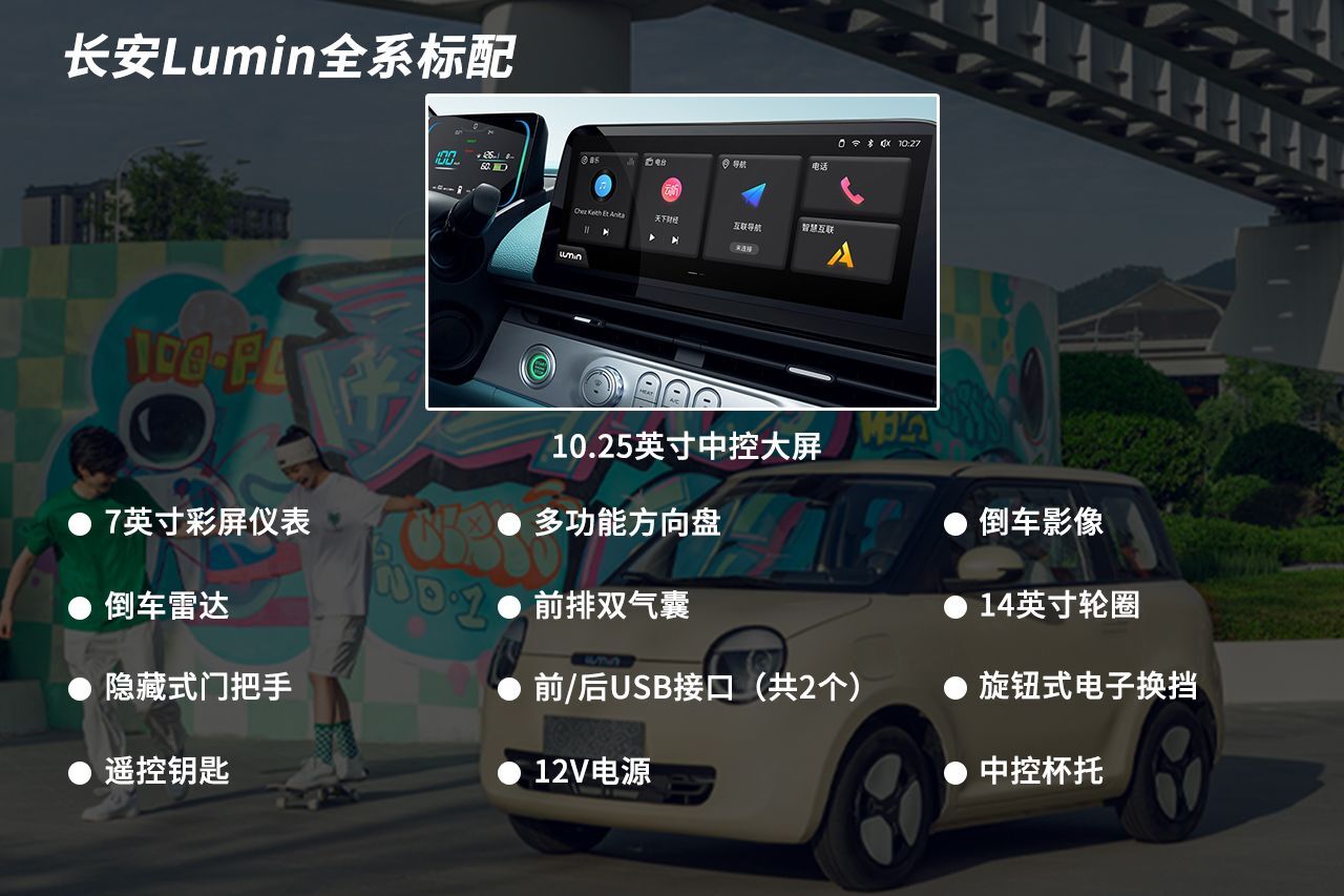 长安Lumin这次共推出3款车型,不过3款车型的配置基本相同,只是在续航方面有所区别。首先我们先看下配置,长安Lumin的配置十分丰富,像是前排双气囊、倒车雷达、倒车影像、多功能方向盘这些非常实用的配置均为标配;而当下消费者十分喜爱的液晶仪表盘和中控大屏也同样搭载,可以说麻雀虽小,五脏俱全,配置表现能够满足绝大多数消费者的使用需求了。