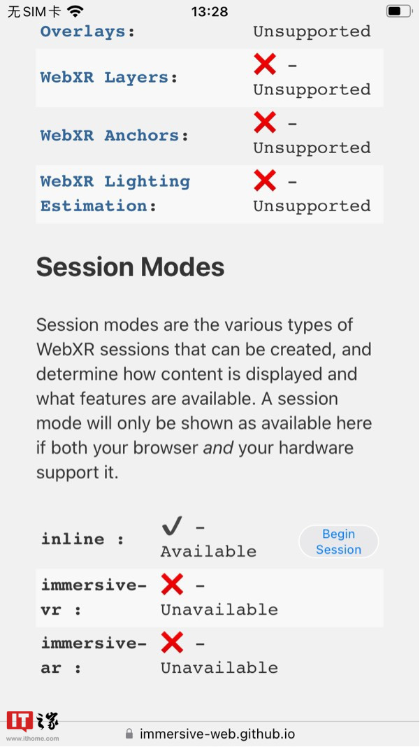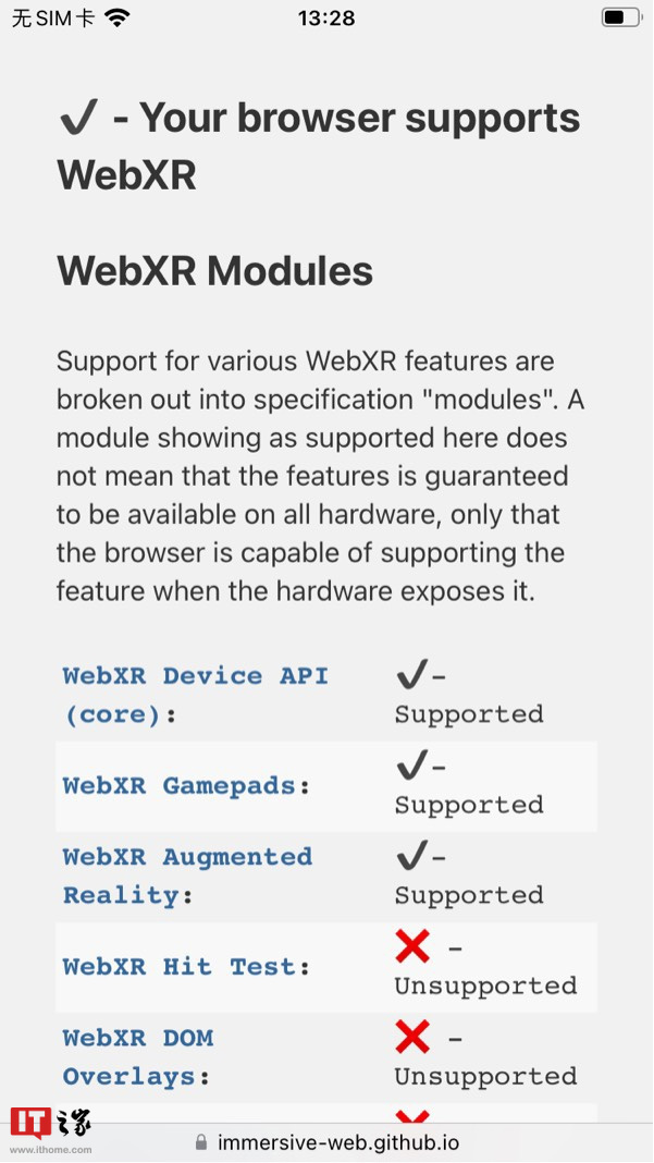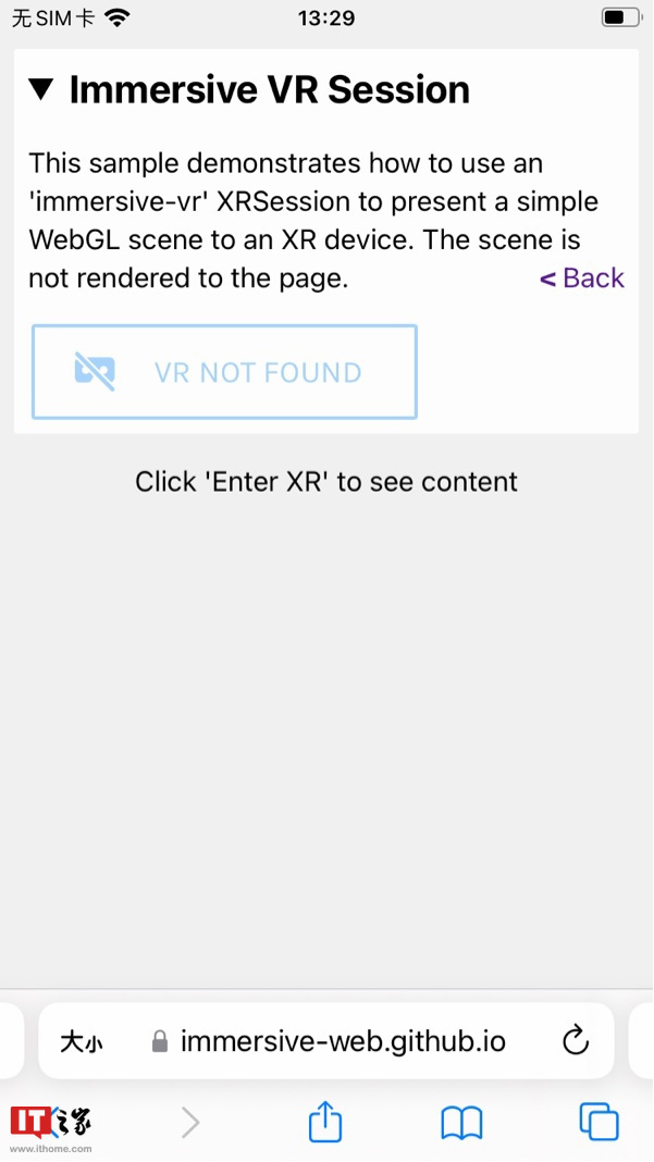 据网友发现,iOS16 Beta 版已支持 WebXR,该标准是一种通用 API,为网站上的 AR 增强现实和 VR 虚拟现实设备提供支持。但是目前实测显示 VR NOT FOUND,还是半成品状态。