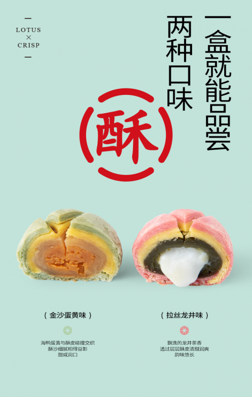 六合信荷花酥在口感与口味上还进行了优化,有两种口味,金沙蛋黄味与拉丝龙井味,可供选择。