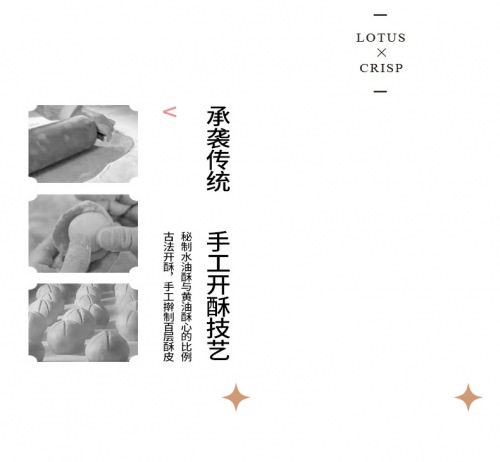 六合信荷花酥并非全程只用机器来完成,因为六合团队觉得手工制作才是有温度的,冰冷的机器无法复刻古代甜品的工匠级艺术。秉承明清时期的百层酐皮工艺,秘制水油酥与黄油酥心的比例,三卷四叠,制出酥皮,1∶1.2的黄金馅皮,一层馅包裹着一层馅,最后精心调整顶端的荷花设计,这些都是冰冷的机器很难完成的。