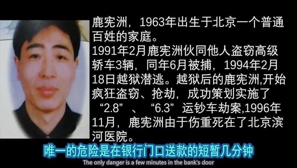 1996年2月8日上午9时50分,北京朝阳区安慧里附近的工商银行甘水桥分理处门口,银行的工作人员正在将钱箱搬进一辆运钞车里,鹿宪洲等人突然蒙面持枪冲出来,不由分说对车内连开数枪,运钞车上的保安员中弹倒地,没等目瞪口呆的银行职员反应过来,劫匪已经抢走了两个装有巨款的运钞箱,乘一辆蓝色大宇轿车逃走了。