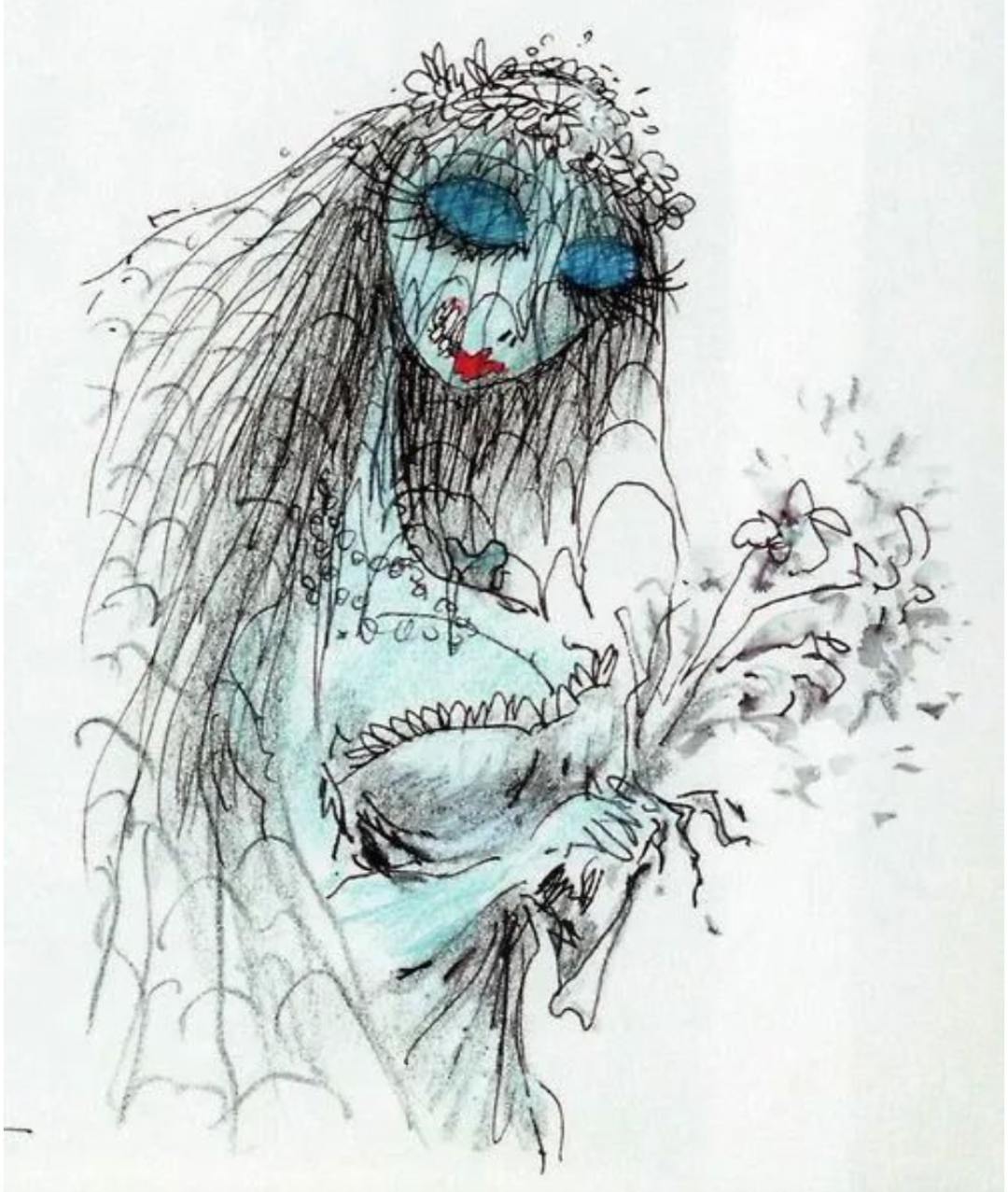 蓝色的皮肤、蛛网质感的发罩以及夸张的睫毛,让僵尸新娘的角色设计显得诡异而又华丽。