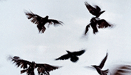 随机,镜头转向天空,乌鸦们快速地飞掠过。