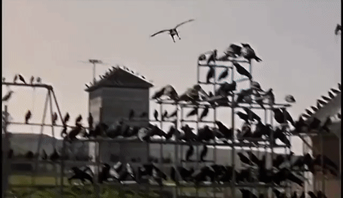希区柯克用了整整四个正反打镜头,来强调鸟群聚集的过程和节奏的推进。