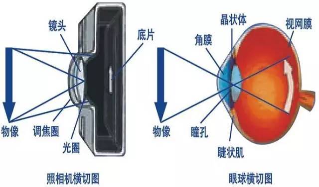 镜头就是眼睛的屈光系统,角膜、房水、晶状体,光圈相当于眼睛的瞳孔,底片相当于眼睛的视网膜,调焦就是睫状带、悬韧带松弛紧张改变晶状体状态达到变焦目的。