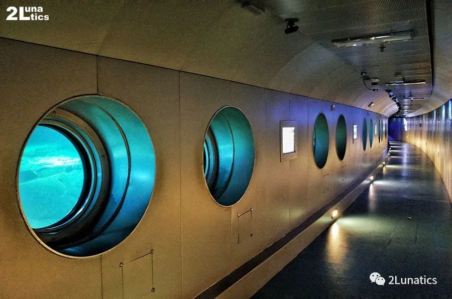 当然更吸引人的是水下部分。我们乘坐长91米的电动扶梯缓缓进入水下,穿越约150米的水平廊道,便步入了长江江心水深40米处的参观廊道。