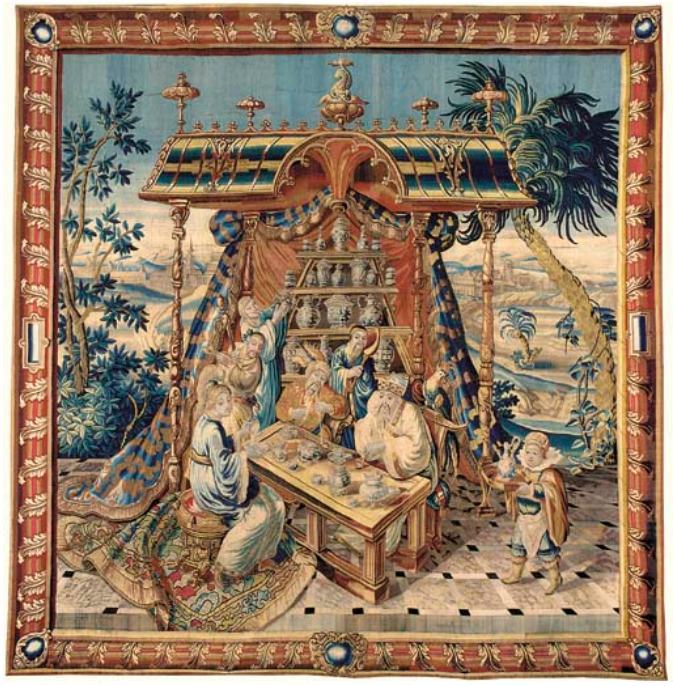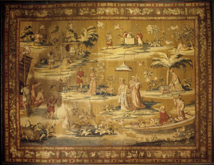 但在17世纪后期,由于“中国风”在欧洲诸国的流行,一类新的主题的挂毯——“中国风”挂毯开始出现,并很快在法国、英国、弗林德斯、德国等多个国家和地区流行与织造。这些“中国风”挂毯,往往以“一套多件”的形式出现,一套出现之后,也往往因受到市场的极大欢迎而在其后较长时间(有的长达50余年)里被反复织造。