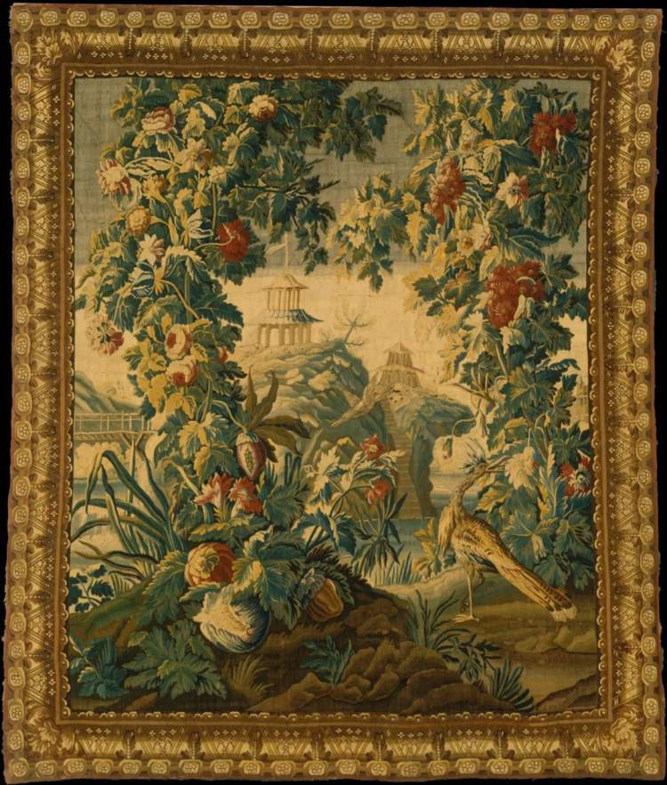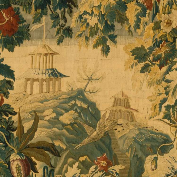 第二套,可名为《“中国风”风景挂毯》,1725年到1730年左右,法国奥布松和费勒坦(Felletin)地区的许多挂毯作坊都在织造这种挂毯,其中最有名的是雅克-多里亚克(活跃于1715–1742)的作坊。以植物为主要表现对象的风景挂毯或翠绿挂毯在欧洲并不陌生,16世纪下半叶就有非常成熟的作品,但“中国风”风景挂毯却在此时才出现。其特点在于以绿色为基调,以动植物和建筑为母题,在非欧洲本地植物之间穿插一两个中式建筑和东方飞禽,打造出一个幽美又宁静的异域秘密花园。