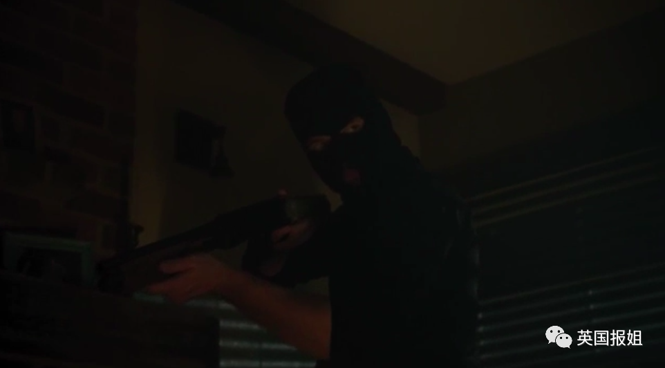 母子三人走到客厅,看到的是一个黑衣人,他带着头套、夜视镜和黑手套,举着猎枪站在那里。这个人正是邓肯。