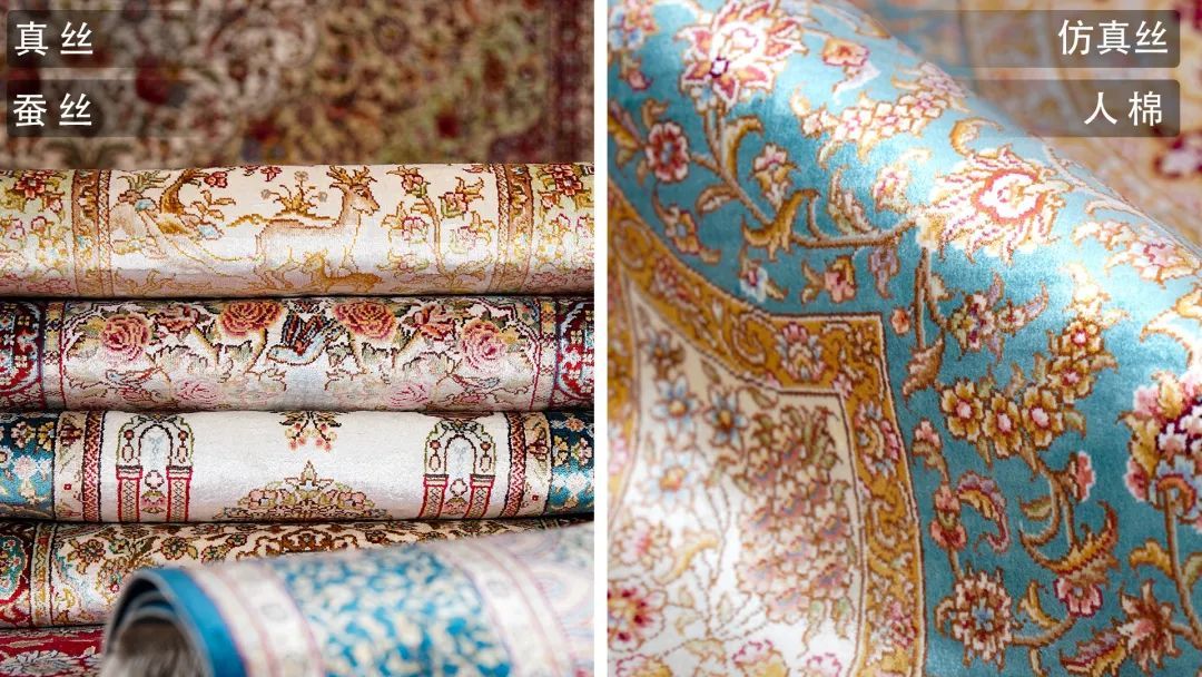目前,我们华新所生产的手工地毯分四个种类:真丝地毯,采用天然桑蚕丝中的白厂丝为材料打结编织而成。绢丝地毯,采用降等丝与细丝混纺成绢丝编织而成。人棉地毯,也叫仿丝地毯,采用人造丝材质编织成毯。丝毛地毯,采用95%进口羊毛结合5%蚕丝打结编织成毯。丝毛地毯很好分辨,但是真丝、绢丝、仿真丝材质怎么分辨呢?