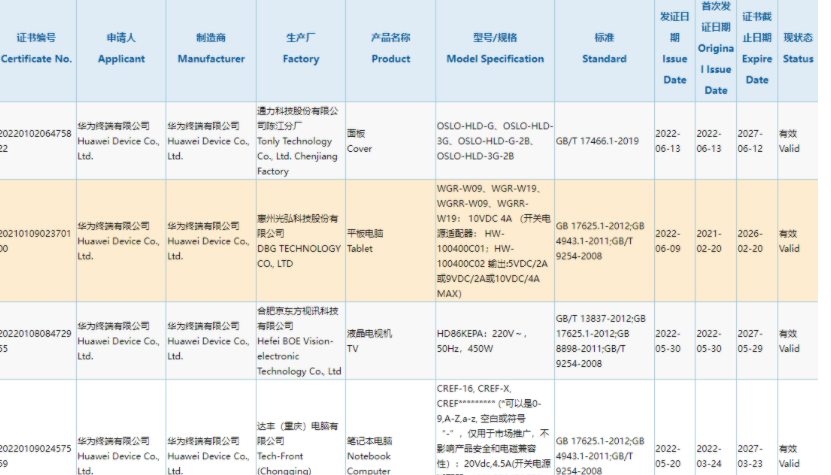 工信部网站显示,目前现有一款型号为 WGR-W09、WGR-W19、WGRR-W09、WGRR-W19 的平板电脑通过了 3C 认证,有数码博主称是华为 MatePad Pro 12.6 2022 款,支持 10V 4A 的 40W 快充。