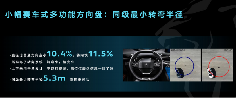 在操控性方面,也是法系车一直以来被人们津津乐道的优点。在标致品牌中,最出名的就是i-Cockpit唯我座舱。采用了小幅赛车式多功能方向盘尺寸比普通方向盘小10.4%,转向快11.5%,搭配电子转向系统,打弯小,精度准,同时上下采用平角设计,不遮挡视线,仪表盘信息一目了然。在同级最小转弯半径5.3m,操控更灵活,还有着同级领先双齿轮转向:精准转向,操作轻便,长久静音,搭配高功率无刷电机和蜗轮蜗杆间隙补偿机构,工作时噪音更小。在DP-EPS的加持下,更大转向助力输出,更精细的转向调校,转向操作手感好,优化的主动回正控制逻辑,转向更加轻松随意。