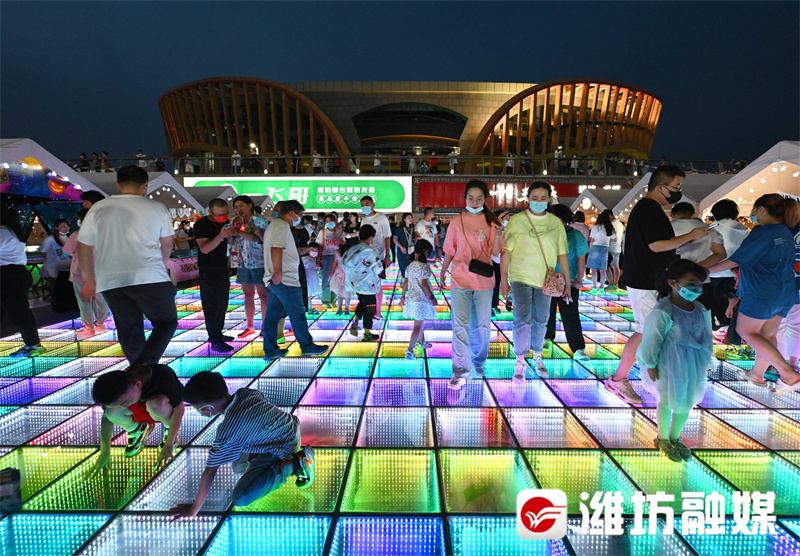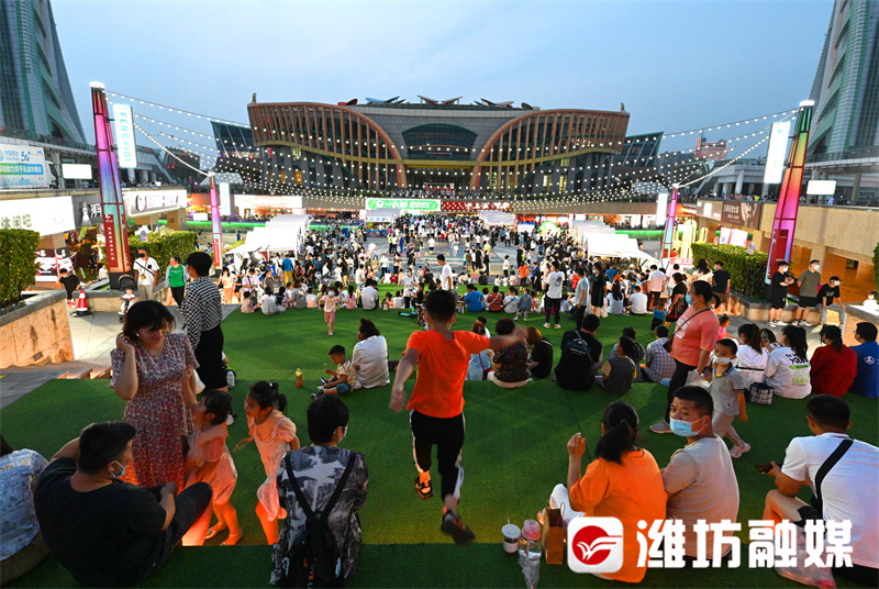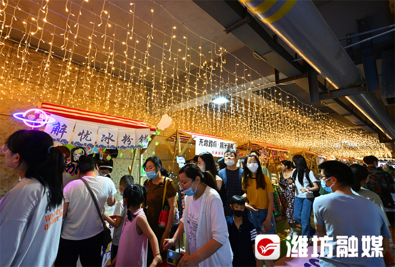 在主力培育凤溪地滨河步行街的同时,开展潍坊城市消费节。今年,市文化艺术中心又在下沉广场开办“万物集”夜市。自6月2日开市以来,“凤溪地万物集夜市”以其独有的文艺气息、潮流体验立即吸引了大量年轻人,每天晚上人流如织、摩肩接踵,为落实疫情防控要求,不到晚8时,各入口处就开始人流管控,等待入场的市民排起了近百米长的队伍。