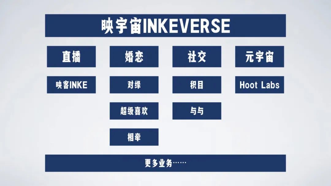 映客互娱集团更名“INKEVERSE映宇宙”后,将成为一家业务范围覆盖直播、婚恋、社交、元宇宙四大业务板块的互娱集团。