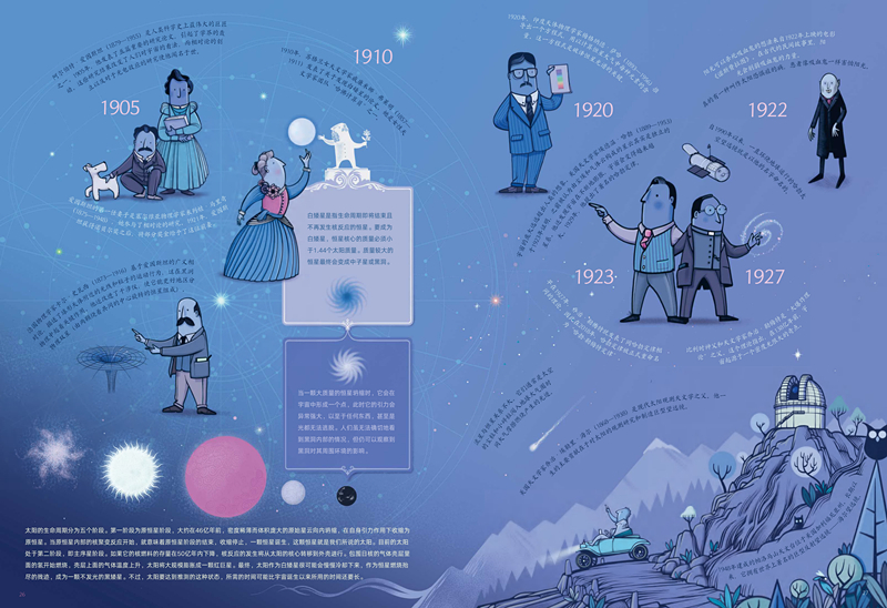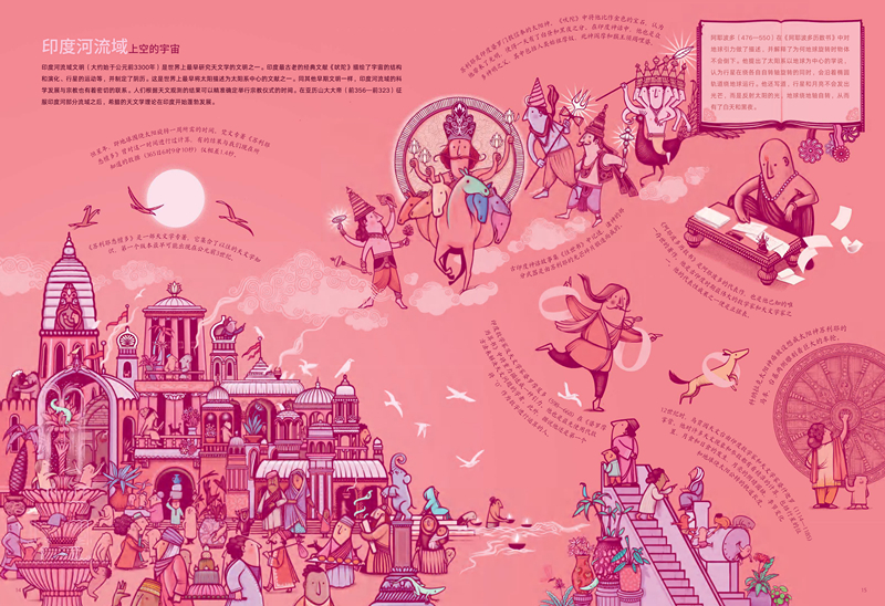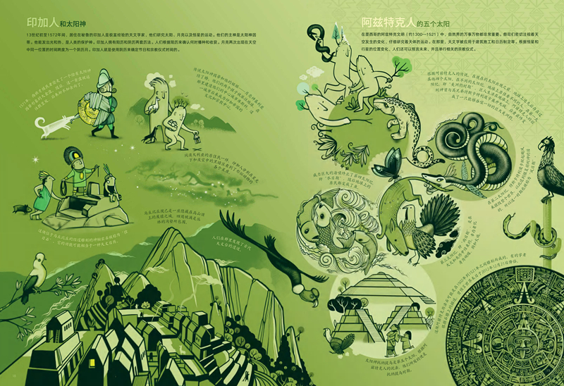 据编辑介绍,该书开本为8开,共有36页手绘高清跨页大图,包含360余个知识点。每一跨页为一个科普主题,包含若干知识点,各知识点相互呼应但又相对独立,既方便读者宏观掌握知识脉络,又利于读者理解消化。每个知识点配有一幅至若干幅准确、生动的插画,不仅呼应文字进行了客观的图解,也使读者对内文的时代背景有了更深了解。例如,开篇的《史前天文学》中列举并介绍了拉斯科洞窟中关于恒星的壁画、在冬至日能照进爱尔兰纽格莱奇墓最深处的阳光、英国的巨石阵、距今3400年的特伦霍尔姆太阳战车等,让读者在时光穿梭中体验世界各地有关太阳的文化积淀和历史传承。
