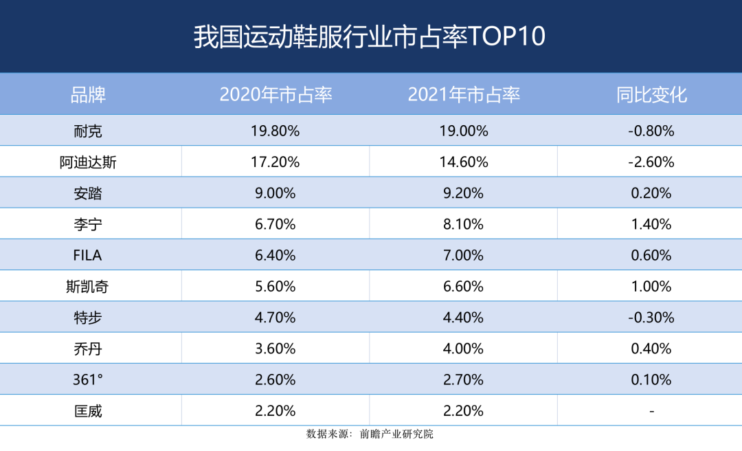 前瞻产业研究院的数据显示,安踏品牌和FILA在国内运动鞋服市场的市占率为16.2%,耐克为19%,阿迪达斯为14.6%。其中,安踏品牌和FILA各自的市占率分别为9.2%和7%。