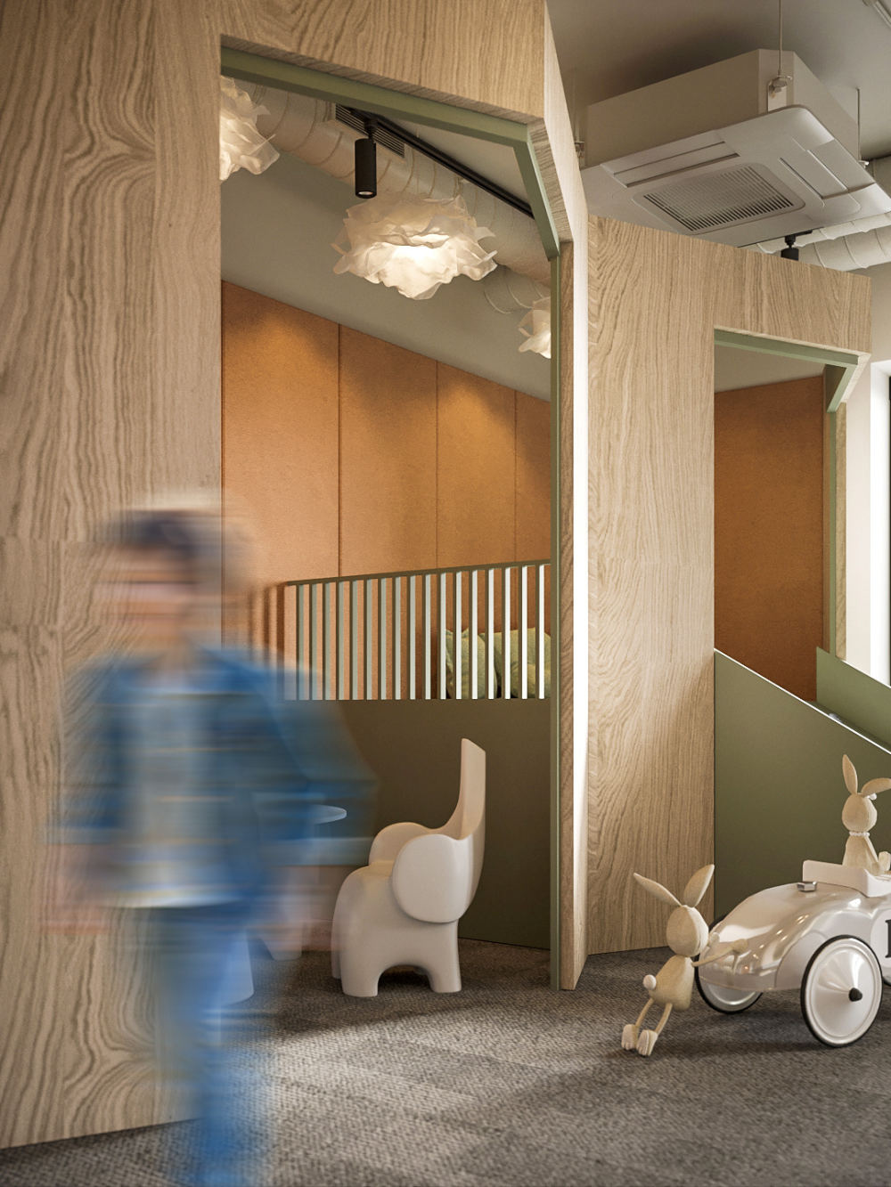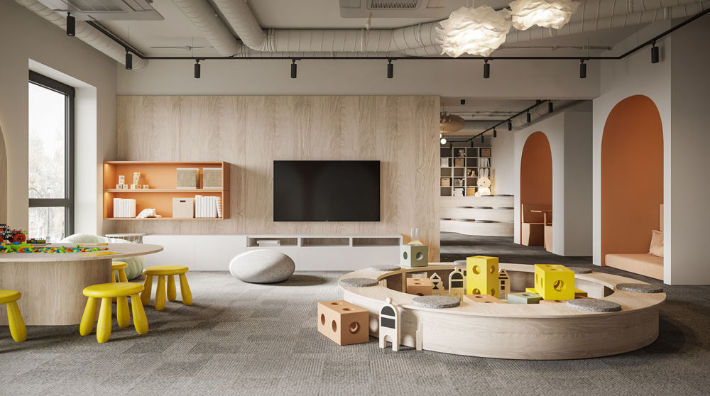 整个空间使用了大量的木材,木材拥有的温暖气质令空间变得亲切,在硬装上使用了低饱和度的橙色和绿色点亮空间,活泼但不扎眼,更适用于儿童空间使用,在后期软装上,儿童中心使用了部分亮黄色的家具和玩具丰富空间中的色彩。整体色调丰富却不凌乱,与空间中的设施相得益彰,十分温馨、舒适。