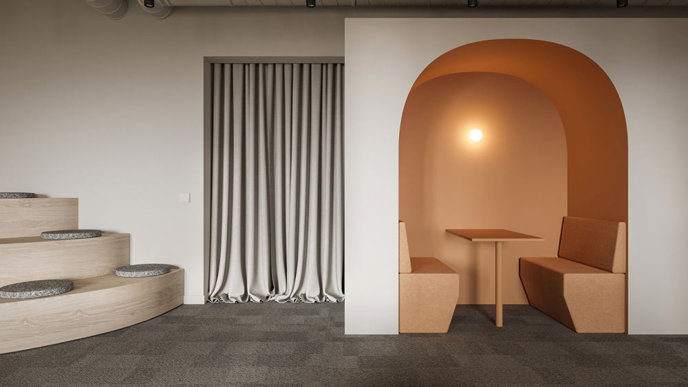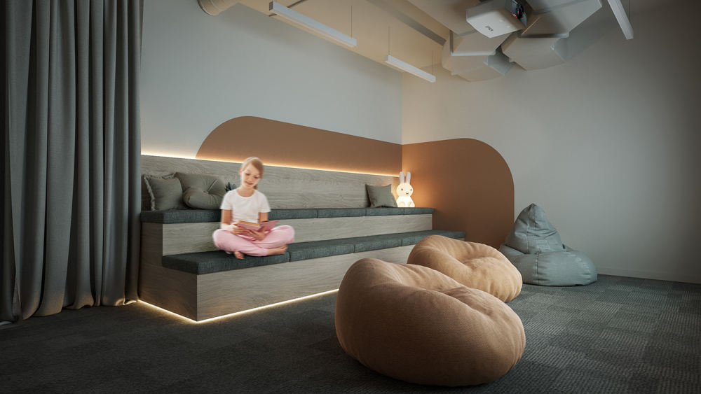 1号游戏室至2号游戏室过道的一侧墙面加厚做了壁龛,设置了两处半封闭的空间,可供成人聊天也可以给儿童休憩或玩耍。