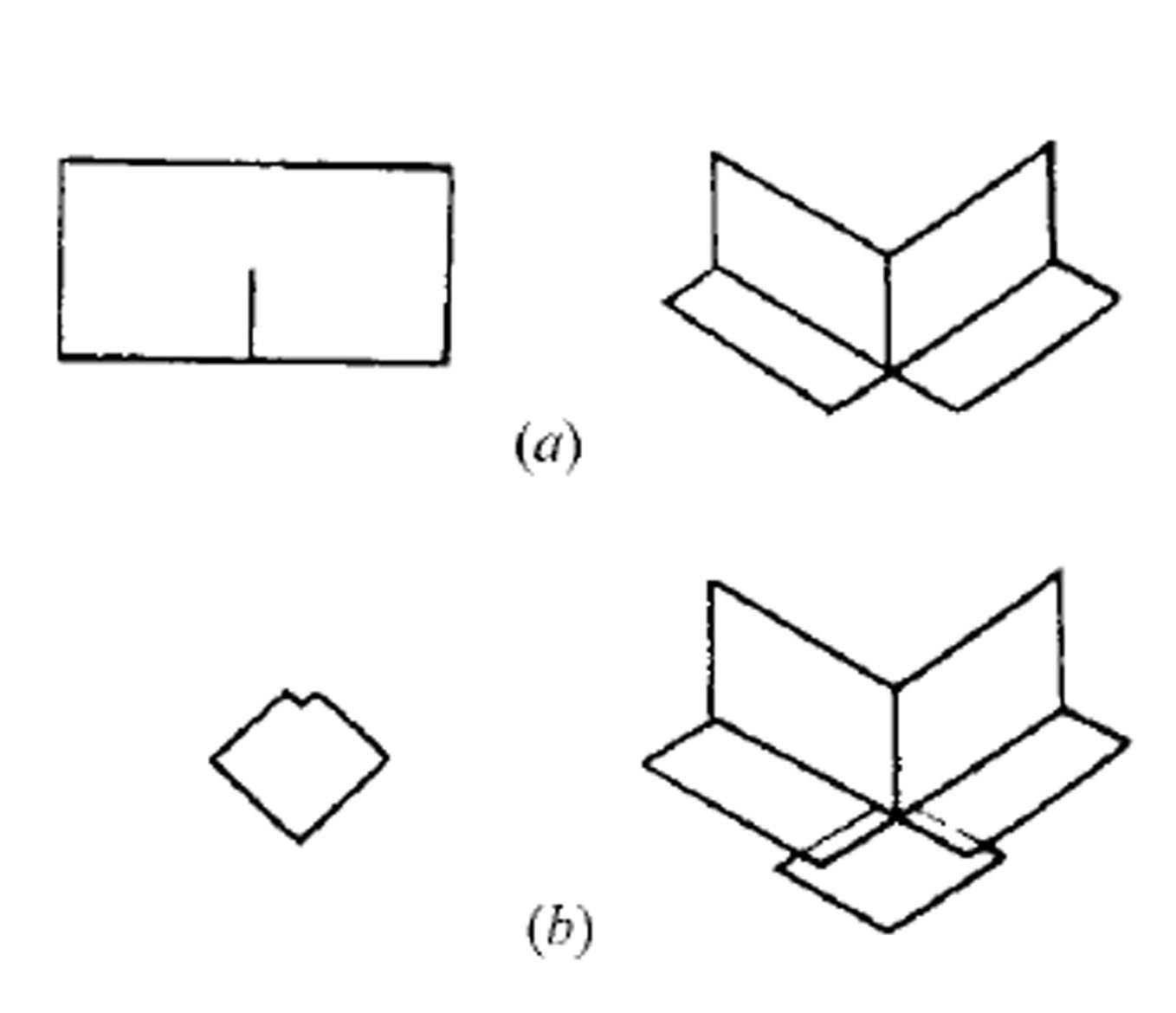 ⑤阴阳角处理:阴阳角是变形比较敏感的部位,此处防水层易被拉裂,由于三面交接,施工比较麻烦,稍有不慎就易发生渗漏。为此在阴阳角处,在基层上距角每边100mm范围内,要先用密封材料涂封,然后再铺贴增强附加层。阳角附加层的剪贴方法见图-1;阴角附加层的剪贴方法见图-2